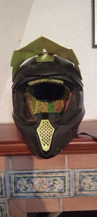 Casco integral MT modelo Falcon, ideal para motocross o enduro. Diseño moderno y seguro. - Color negro con detalles en amarillo neón. - Visera ajustable. - Interior cómodo y transpirable. Practicamente nuevo solo tiene un poco descolirida la visera