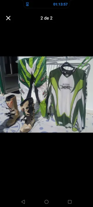 Conjunto de ropa para motocross, ideal para la práctica deportiva. - Camiseta de manga larga con diseño en verde y blanco. - Pantalón a juego con detalles en verde y blanco. - Botas de motocross resistentes.