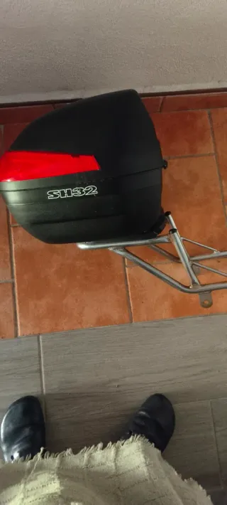 Baúl de moto SH32 con soporte para Honda Rebel 250. Ideal para llevar equipaje. - Color negro con detalles rojos. - Incluye sistema de anclaje.