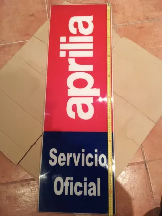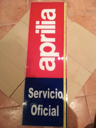 Panel de metraquilato de la marca Aprilia, parte de un cartel luminoso. - Diseño con el logo Aprilia en rojo y blanco. - Sección inferior con el texto Servicio Oficial en azul y blanco.