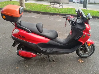 Maxi scooter de 125cc en buen estado, ideal para moverse por la ciudad. - Diseño deportivo en color rojo y negro. - Maleta trasera naranja para mayor capacidad de carga. - Parabrisas alto para mayor protección.
