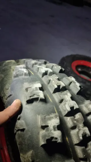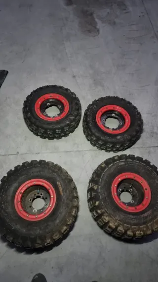Se venden llantas y neumáticos para Suzuki LTZ. El conjunto incluye 4 unidades. - Llantas con aro rojo. - Neumáticos todoterreno.