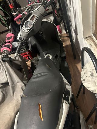 Arranca y funciona, con papeles, sin ITV Los frenos van perfectos (disco delantero y pastillas nuevas), bomba de aceite nueva, filtro aire nuevo, correa transmision nueva, puños nuevos, escape LeoVince ZX homologado con siñencioso nuevo Hay que acerle algunas cosas como mirar perdida de agua,limpiar radiador y comprobar luces y velocimetro. Entrego escape original, caballete y retrovisores originales. La vendo porque no tengo tiempo de seguir dejandola a punto. Negociable Cambio de titular a cargo del comprador Venta en persona, + info por privado