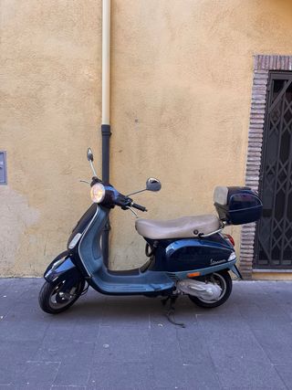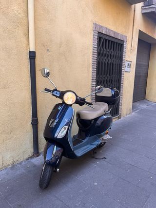 Scooter Vespa LX 50cc en tonos azul y beige. Un vehículo ágil y práctico para la ciudad. - Diseño clásico y elegante. - Asiento cómodo para dos personas. 850€ Mantenimiento recién hecho. Carburador original nuevo. Manguitos de gasolina nuevos. Sistema de encendido nuevo. Neumáticos y pastillas en buen estado. La moto está a punto para ser usada a excepción de la ITV y el seguro. Tiene algunos arañazos de chapa por uso.