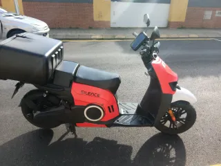Moto eléctrica Silence S02 con un diseño moderno y funcional. Ideal para desplazamientos urbanos. - Color principal rojo con detalles en blanco. - Baúl de carga negro en la parte trasera. - Asiento cómodo para el conductor.