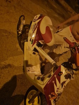 Moto personalizada con un diseño único. - Asiento bicolor (blanco y rojo). - Llantas amarillas. - Adhesivos decorativos temáticos. O cambio por algo k me interesaría
