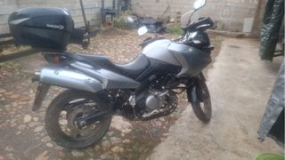 Moto Suzuki V Strom en color gris y negro. Cuenta con maleta trasera SH50X. ITV hasta 2027 - Diseño tipo trail. - Escape plateado. - Rueda trasera con llanta de aleación.