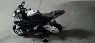 Moto eléctrica BMW para niños, ideal para que los más pequeños disfruten. - Diseño deportivo en blanco y negro. - Ruedines de apoyo para mayor estabilidad.