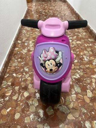 Moto de juguete con diseño de Minnie Mouse. - Color rosa y morado. - Detalle de Minnie Mouse en la parte frontal. - Manillar negro.