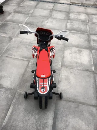 Moto eléctrica de la marca Injusa en color rojo. - Diseño deportivo. - Ruedines de apoyo. - Manillar con puños. - Asiento ergonómico.