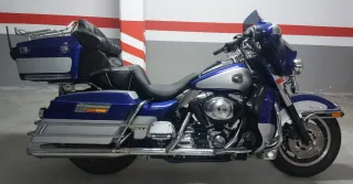 Harley Davidson Ultra Classic modelo 2007 (5HD). 1584cc, 6 velocidades. ITV hasta octubre 2026. 140.000 km. Único propietario. Extras: Escapes Vance and Hines, entrego los originales. Puños old scholl, parrilla del baúl tour pack, las bolsas-maletas de las alforjas y baúl. Deflectores para el calor del motor, bombilla led en el foco, estabilizador del chasis. Con Stag 1 (escapes, filtro de alto flujo y centralita Power Commander3). Siempre ha dormido en garaje. - Color azul y plateado. - Estilo touring.