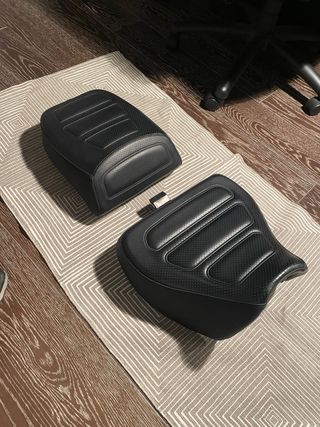 Asientos de conductor y pasajero Sundowner para Harley Davidson Pan America. Diseñado para ofrecer comodidad en largos recorridos. Precio original:486€+223€=709€ - Acabado en cuero negro. - Diseño con perforaciones.
