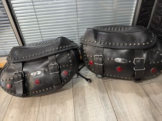 Bonitas maletas de piel para Harley Davidson, en muy buen estado. - Dos maletas de piel negra. - Con remaches metálicos. - Cierre con hebillas. - Detalles reflectantes rojos.