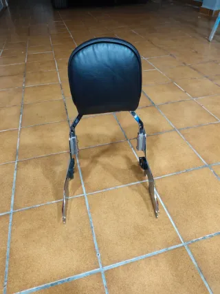 Respaldo para motocicleta Harley Davidson. Fácil de quitar y poner, ya que se engancha con un click. Muy poco uso ya que solo se montaba cuando llevaba a mi hija a algún paseo... Solo el respaldo, por qué se vendió la moto y no caí en cogerle los topes que van a la moto pero cuestan 12 euros en Amazon El respaldo nuevo costó 200 euros y está NUEVO. - Material: cuero sintético negro. - Acabado cromado en los soportes.