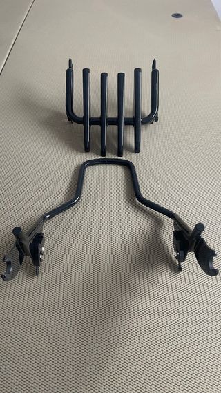 Respaldo y parrilla para motocicleta Harley Davidson. Pieza de metal con acabado oscuro. Montados en una touring Se vende sin el cojín En perfecto estado (casi nuevo) - Diseño curvo en el respaldo. - Parrilla con barras horizontales.