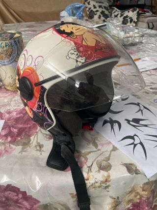 Casco de moto con un divertido diseño de Betty Boop y un cachorro. - Diseño llamativo con Betty Boop. - Incluye visera transparente. - Cierre de seguridad.