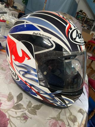 Casco de moto Arai con diseño Drudi Performance. Un casco de alta calidad para motociclistas. - Diseño deportivo y llamativo. - Marca Arai reconocida por su seguridad.
