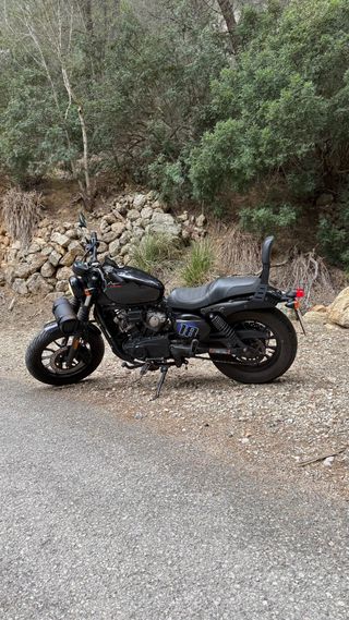 Moto custom Hyosung Aquila 650 en color negro y detalles cromados. Con caja trasera. - Estilo cruiser. - Transmisión manual. -Rueda trasera nueva. -Bateria nueva. -ITV hasta el 2027. -Año 2007 y con 39000km.