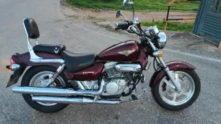 Moto estilo cruiser Hyosung Aquila en color burdeos. - Motor V-Twin. - Neumáticos en perfecto estado. - ITV hasta 2027. -Aceite motul 5100 y filtros recién cambiados, líquidos de freno y pastillas delanteras. -Faro con bombilla LED. -Barras antivuelco y alforjas de piel(No se ven en imágenes). -15500 km