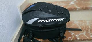 Mochila negra de la marca Motocentric, diseñada para llevar cascos. - Diseño con cordones elásticos en la parte frontal. - Logo de la marca en la parte superior. - Incluye una funda impermeable negra.