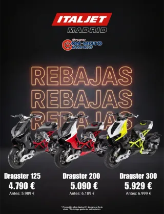 REBAJAS Oferta especial para unidad en stock. DRAGSTER 125 (negro mate): 4.790 € *Válida para el carnet B DRAGTER 200 (blanco/rojo): 5.090 € DRAGTER 300 (amarillo/blanco):5.929 € Financiación a tu medida Consultanos. Grupo On Moto. Concesionario oficial Suzuki, Zontes, Italjet, Hero y Bsa. En López de Hoyos 82 e Infanta Mercedes 41 (Madrid) y en Naranjos 6 (SS de los Reyes)