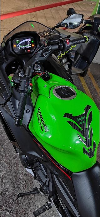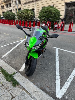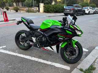 Moto deportiva Kawasaki Ninja 650 en color verde brillante y negro. Diseñada para un rendimiento ágil y una conducción emocionante. 10100km Primera matricula 8/10/2023 Limitada A2 Ultima revision 1/2/2026 - revision 10.000km - Diseño aerodinámico. - Asiento deportivo. - Sistema de escape Akrapovič no homologado. Escape + tubo original disponible. Vendo porque me voy comprar una 1000cc.