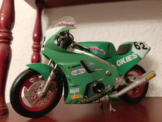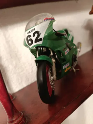 Réplica de motocicleta deportiva Kawasaki Ninja con el número 62. - Diseño deportivo en verde y blanco. - Detalles de patrocinadores. - Exhibida en estante.