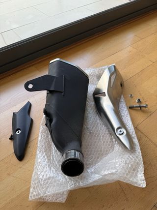 Tubo de escape de serie de la kawasaki z900 2021. Componentes de sistema de escape para motocicleta. - Silenciador negro con detalles plateados. - Protector de metal pulido. - Pieza de plástico negro.