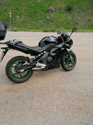 Kawasaki ZX-6R mediados 2007,km55.900 lleva un piñón más atrás,por lo que tiene menos kilómetros,125cv.de serie,se puede limitar en papeles(foto)se le ha hecho cambio de aceite y filtro,limpieza de filtro de aire BMC,reglaje de válvulas hace 4000 km,pastillas Brembo nuevas,amortiguador de dirección ohlins,cola de escape mivv suono de fibra de carbono,colectores sobredimensionados artesanales 4 en 1,porta matrículas e intermitentes pequeños tapa de colín,cúpula ahumada doble burbuja,topes anticaída,manetas regulables y abatibles, Latiguillos metálicos delanteros,doy todo lo de serie para ITV.Tengo tarjeta para homologar el escape