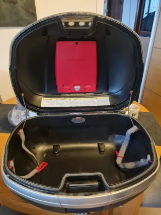 Baúl Givi con herrajes de soporte para moto (antes estaba en una Kawasaki er6f ), ideal para transportar tus pertenencias de forma segura. - Diseño moderno y funcional. - Acabado en negro y plateado. - Incluye cerradura, 2 llaves y botón de apertura.