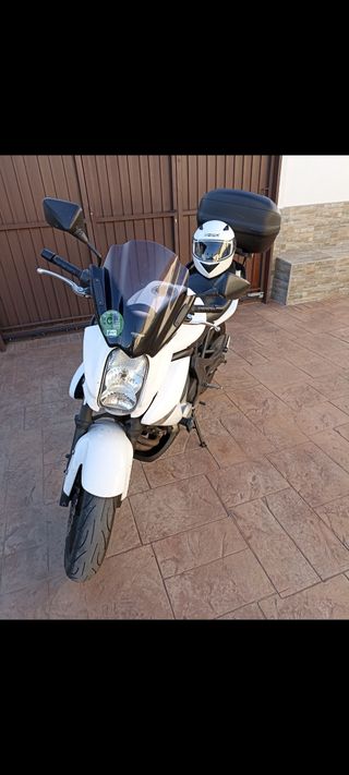 Kawasaki er-6n del 2008 con 57.300km Con 55.3000 cambiada la rueda trasera y el kit de arrastre Se vende por no tener tiempo para cogerla, goma de intermitentes traseros pasadas por el tiempo. Incluido: Cúpula Soporte teléfono móvil Indicador de marcha Maletas GIVI Topes anticaidas