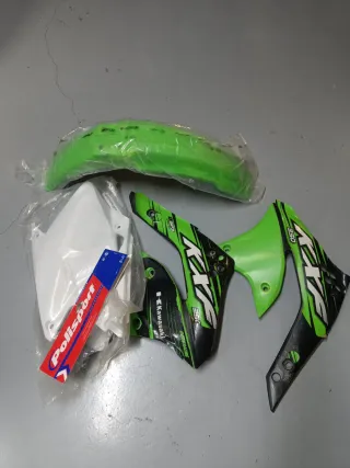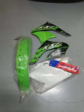 Kit de plásticos para Kawasaki KXF del año 2006. ( Precio por todo)Incluye guardabarros delantero y tapas laterales. - Guardabarros delantero verde. - Tapas laterales verdes y negras con diseño. - Incluye adhesivo Polisport.