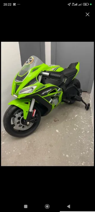 Moto eléctrica infantil con diseño deportivo Kawasaki Ninja. - Color verde brillante con detalles negros. - Ruedines de apoyo para mayor estabilidad. - Diseño inspirado en la moto Ninja. Bateria en excelente estado .