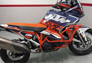Moto KTM 1290 Super Adventure R en llamativos colores naranja y blanco. Va cargada de extas, escape Arrow homologado, caja herramientas metal, amortiguador de dirección, maletas y soportes touratech metal, revisiónes todas en concesionario oficial, 42000km ,Asientos originales y otros dos masTech ,soportes telf y gps Etc,etc. Muy mimada. ALGO negociable. MEJOR VER