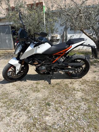 Moto KTM Duke 125 con ABS. Diseño deportivo en blanco y naranja. - Todos los mantenimientos hechos al día. - ITV hasta Octubre de 2027 - Siempre duerme en garaje. - Kit de arrastre completo nuevo (Cadena, corona y piñón). Cambiado hace menos de 1000 km. - Filtro del aire, aceite y filtro de aceite cambiado hace menos de 1000 km. - 20.450 km. La vendo por cambio de carnet A2. La moto va genial y muy fina en el paso por curva. Para comenzar en este mundillo en mi opinión es la mejor que hay. Va sobredimensionada en cuanto a componentes (amortiguador, frenos, ruedas,...) Lo que la hace muy segura para su uso.