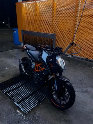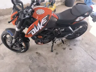 Moto KTM Duke 125 en color negro y naranja. La moto está en perfecto estado, está mimada al detalle ahora lleva un par de meses en el parking por poco uso. Nunca ha dado problemas, mantenimientos al día. - escape de serie lo tengo - retrovisores de serie lo tengo - porta matrículas de serie lo tengo. - Transmisión manual.