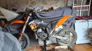 Moto KTM de estilo enduro y motocross, con una combinación de colores naranja y negro. - Año 2006, - 250 2tiempos -ITV hasta Febrero de 2027 -Lista para funcionar -Escape FMF pero tengo piezas de casa.
