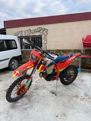 Moto de enduro de dos tiempos. moto usada por un aficionado con todo hecho, lista para usar. fue del grupo ktm hay todos los recambios ya que comparte todas las piezas menos las aletas de los plasticos la vendo con el kit itv con itv hasta diciembre del 2027 kit de arrastre nuevo sistema de arranque electrico entero nuevo piston A suspensiones hechas en octubre del 2025 se acepta prueba cualquier tipo de prueba dudas y mas aclaraciones por privado (husaber te 125 250 300 2t fe 390 350 450 4t ktm exc f 250 husqvarna tpi tbi )