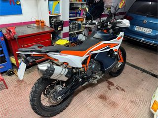 Moto KTM 790 Adventure R con un diseño deportivo y llamativo. - Diseño en naranja y blanco. - Estilo de moto de aventura. - ITV recién pasada hasta 04/2028 - Kit de arrastre nuevo reforzado (Corona, piñón y cadena) - Pastillas traseras nuevas - Cambio reciente de aceite y filtro - Top case GIVI Dolomity 46 L con respaldo - Herraje y alforjas GIVI Canon original - Escape IXIL con db killer (se entrega el original) - Mapa rally instalado para configurar entrega de potencia y aceleración Moto muy bien mantenida y cuidada, facturas de todo.