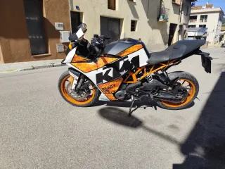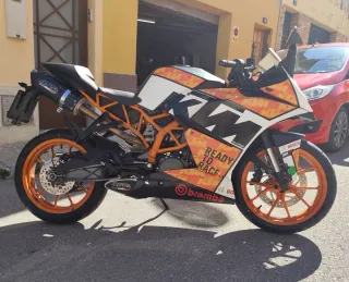 !KTM RC 125 IMPRESIONANTE! se vende ktm rc 125 va perfecta la moto con sus mantenimientos echos a los 25.000km aceite,filtro de aceite y comprobacion de reglaje de valvulas. A los 30.000km habria que hacerle el reglaje de valvulas y cambiar el aceite del motor y el filtro de aceite. La moto lleva mucho cariño como se ve en las fotos lleva alguna cosa. -ALERON DELANTERO. -RETROVISORES DE CARBONO CON INTERMITENTES INCORPORADOS. -CUPULA DE BURBUJA. -LUCES LED. -PEGATINAS PERSONALIZAS. -LINEA COMPLETA, ESCAPE AKRAPOVIC ORIGINAL Y TENGO TODA SU DOCUMENTACION. -INTERMITENTES TRASEROS INCORPORADOS EN EL CARENADO para mas informacion