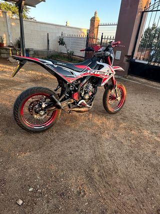 Moto Rieju MRT del año 2023 con estilo supermotard. Se vende de casa y si quieres el trucaje aparte. Motor recién hecho. Manetas doppler Cubrepiñon doppler Cubre bomba de freno doppler Cubrecadenas most Esponja scar Careta ktm Obturador krm Rotor mvt naranja Espace mjc 70-80 80cc airsal Carburador rdc 28