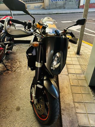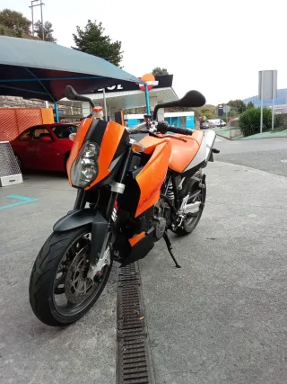 Moto KTM Super Duke 990 R en excelente estado. Una moto deportiva y potente. Año 2007 - Diseño agresivo y deportivo. - Manillar ancho para mayor control. - Guardamanos integrados. ITV pasada el 24/10/2025 sin fallos escapes homologados acepto prueba mecánica con tu mecánico de confianza no hay k hacerle nada batería nueva y arranque recién cambiado la moto está para hacer km no hay k hacerle nada tiene llanta trasera con 100 km y delantera al 70 % moto con un torque increíble y sonido espectacular km en la foto precio algo negociable venta por retirada de carnet