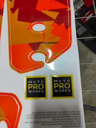 Kit de vinilos para moto KTM de la prestigiosa marca Moto Pro Works. Es un kit que por error me enviaron de otro modelo,ojo,es de la KTM SUPER ADVENTURE R no la S,muy importante por qué no son las mismas.Gracias. - Incluye varios adhesivos. - Diseño camuflaje. - Marca: Moto Pro Works.