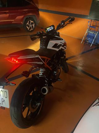 Moto KTM Duke 125 La compré el verano pasado para introducirme en el mundo de las motos y ahora la cambio para comprarme una del A2. Precio negociable. - Sillín powerparts. - Manillar con puños naranjas. - Escape Akrapovič (homologado). - Entera vinilada (por debajo blanca). - Topes anticaida. - Incluye extras aparte (varios retrovisores, palancas de freno y cambio de marcha y otros puños). - Se entrega todo lo de serie. -ITV hasta el 2027.