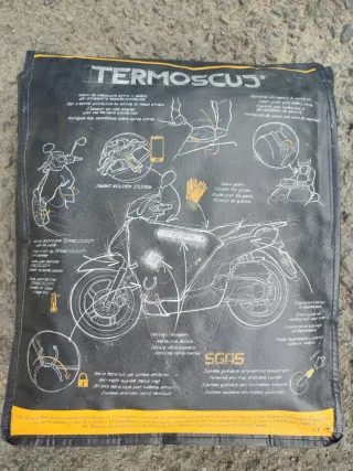 Cubrepiernas/Manta de lluvia para moto Kymco, modelo TermoscuD, sin estrenar. - Sistema de cierre con correa de seguridad. - Detalles reflectantes para mayor visibilidad. - Anillo metálico para candado antirrobo. - Cubierta impermeable y elástica. - Bolsillo para guantes
