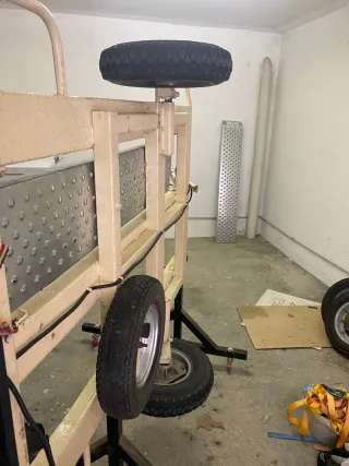 Remolque para transporte de 3 motocicletas, documentado y con soporte para guardarlo horizontal.