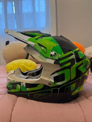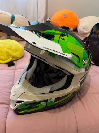 Casco de motocross Scorpion en talla XS. Presenta un diseño llamativo con detalles en verde y blanco. - Cierre de doble anilla. - Visera ajustable. - Interior acolchado para mayor comodidad.