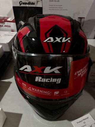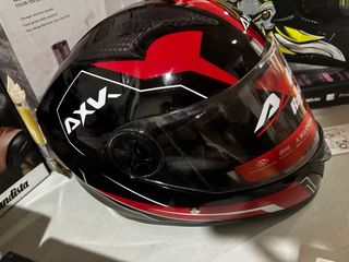 Casco de moto AXV Racing, en excelentes condiciones. Es un casco integral con diseño rojo y negro. - Diseño deportivo. - Visera transparente. - Marca AXV Racing. -Cuello de pelito desmontable para invierno