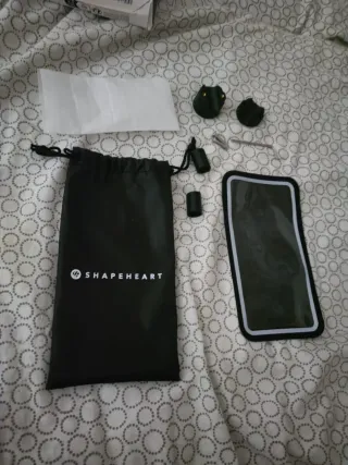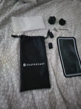 Soporte para móvil de la marca SHAPEHEART, diseñado para motocicletas. Incluye bolsa de transporte. - Bolsa de tela negra con logo SHAPEHEART. - Funda transparente para el móvil. - Dos soportes negros. - Piezas metálicas pequeñas.