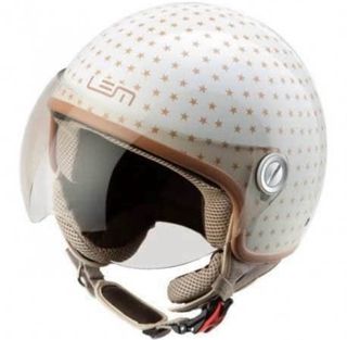 Casco de moto LEM con un diseño de estrellas. - Color base crema. - Estrellas en tono dorado. - Visera transparente. - Ribete marrón. NUEVO!